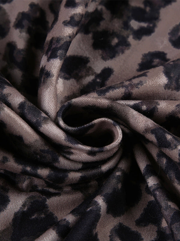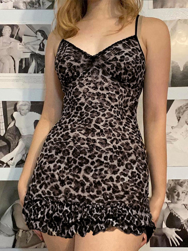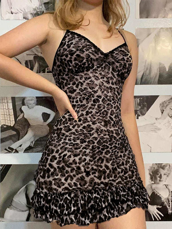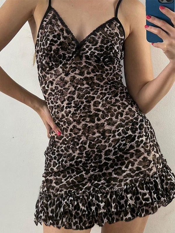 Vintage Lace Stitching V Neck Mini Dress with Leopard Print