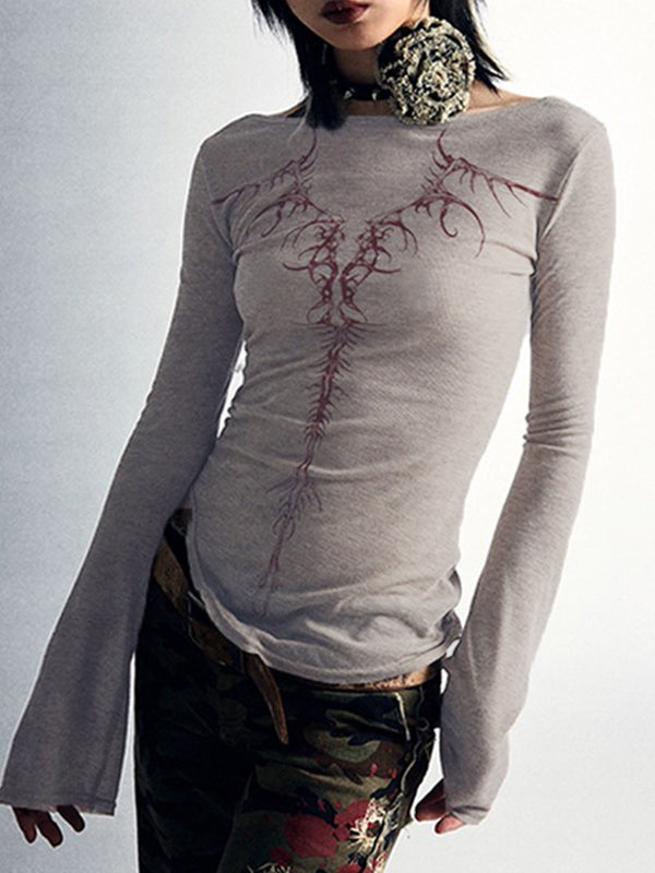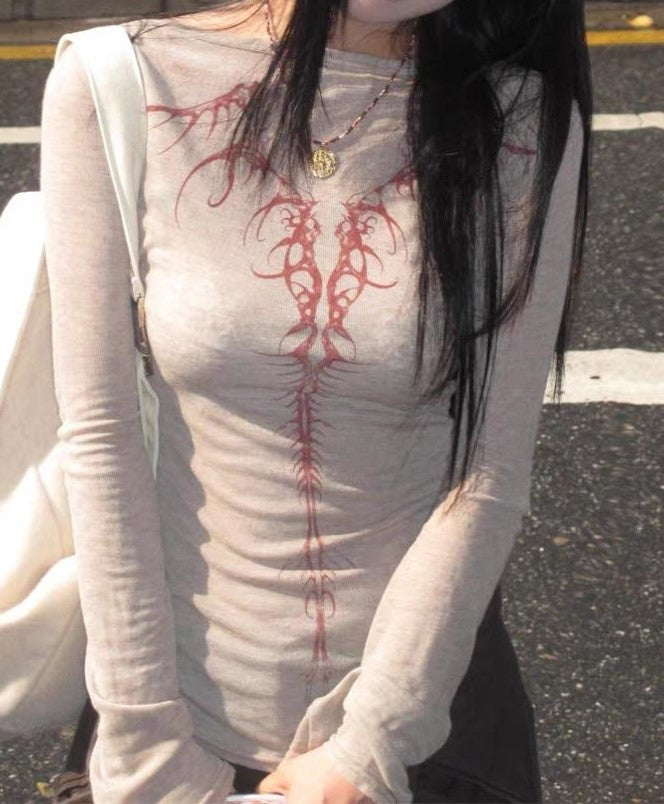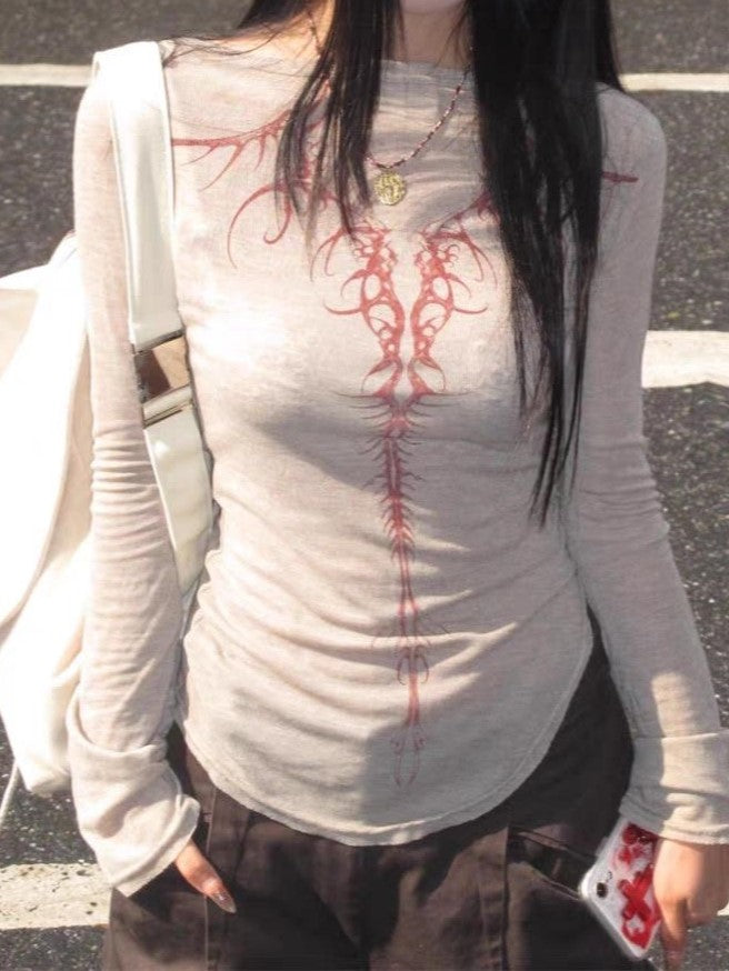 Vintage Reversible Slimfit Long Sleeve Knit Top with Print