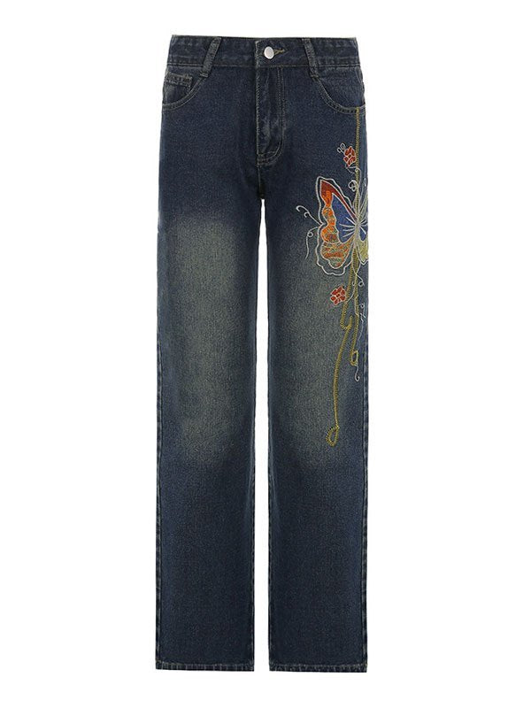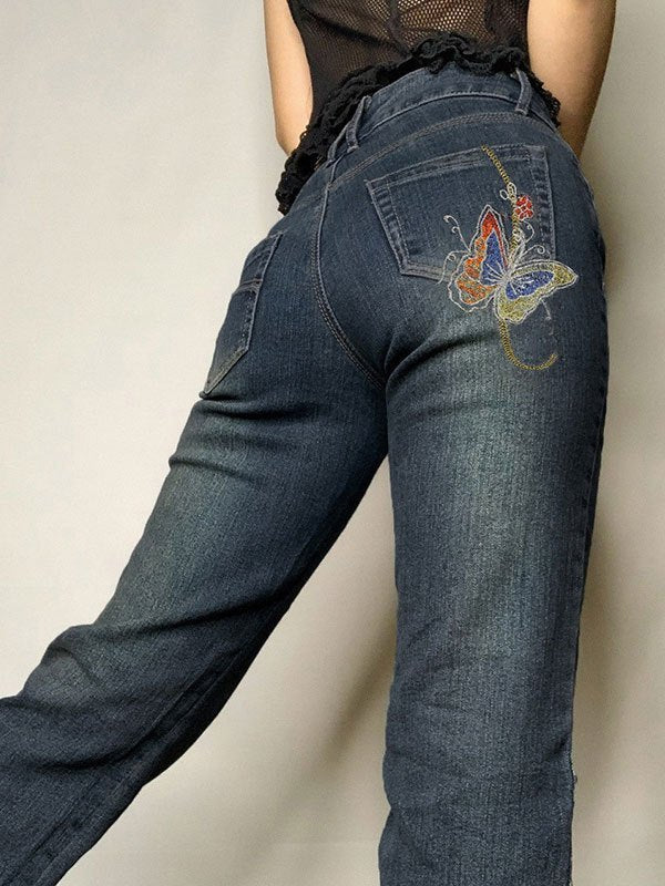 Vintage Washed Effect Flare Jeans with Butterfly Print