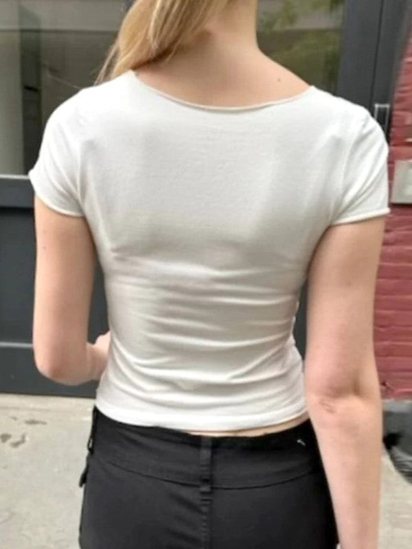 White Lace Trim V Neck Ruffle Short Sleeve Knit