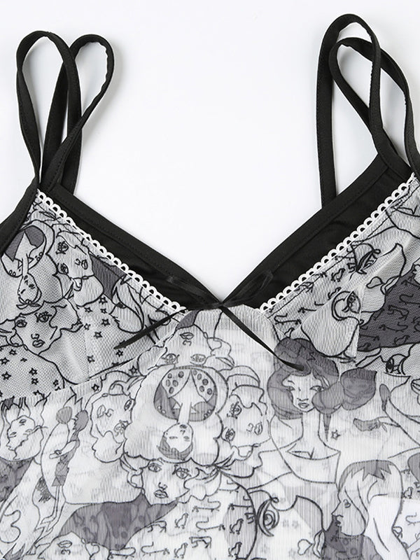 Y2K Graffiti Printed Tulle V Neck Mesh Cami Top
