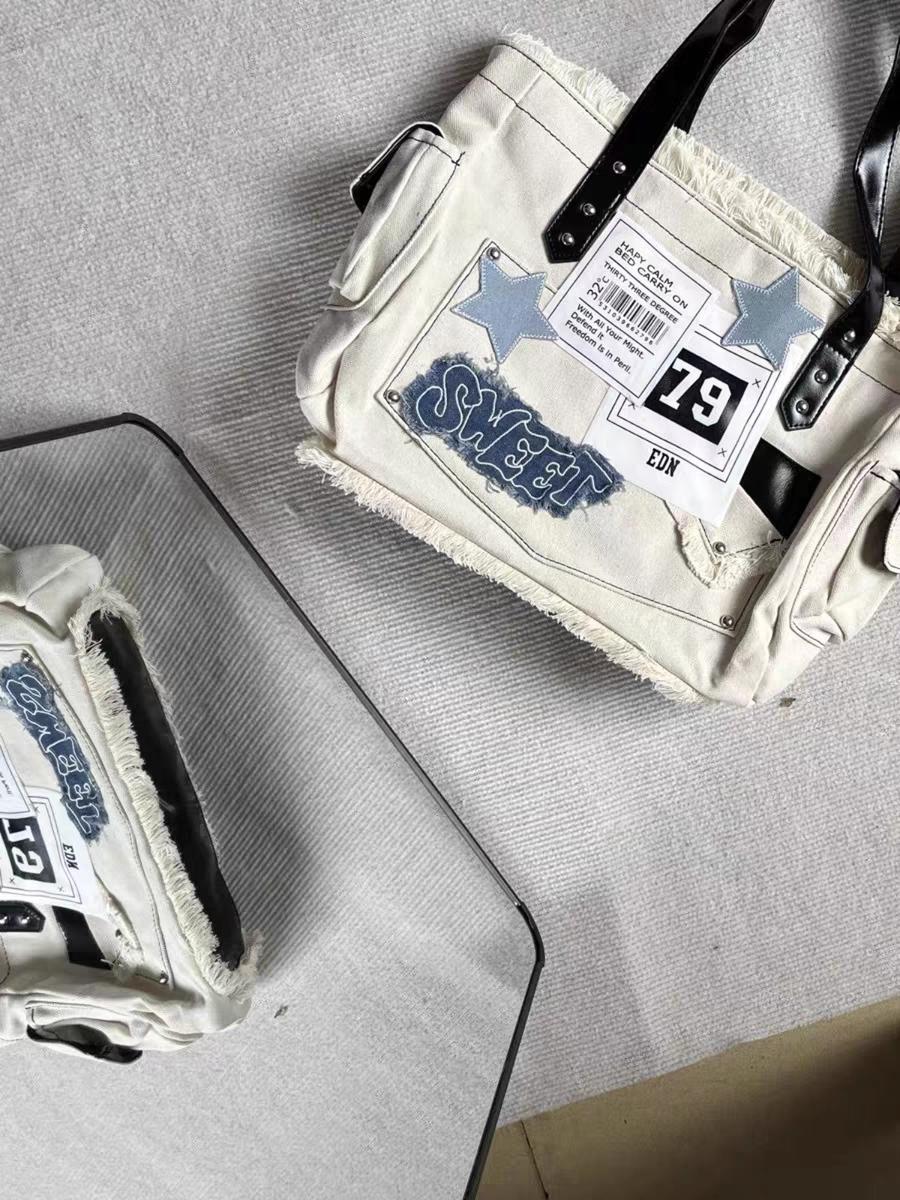 Details: It features a detachable long shoulder strap. an embroidered star. and some label patches.