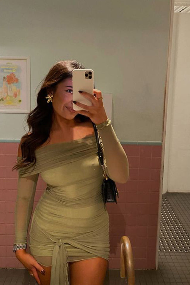 Meet your new go-to dress for any occasion - the Yasmin Off Shoulder Dress. The classic off shoulder design gets a modern twist. crafted in a sheer mesh fabrication and full jersey lining throughout the body. The sarong style skirt with ties allows for a customisable fit.