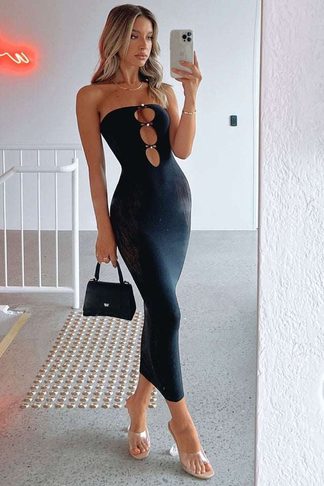 The Your Peace Mesh Midi Dress deserves a night out. This stocking midi dress features cut-out bust/midriff design with diamanté detail. open back design and midi length.